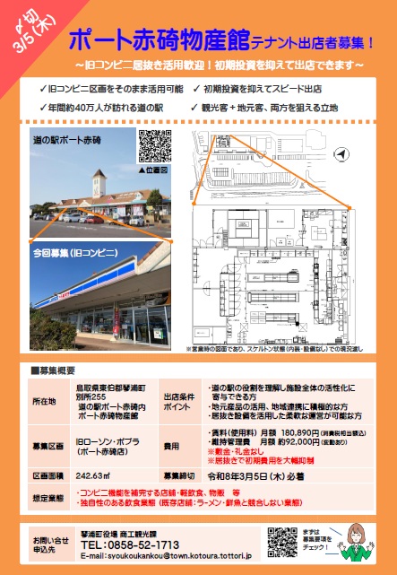 道の駅「ポート赤碕」旧ローソンポプラ赤碕店区画の新規テナント出店者を募集しています。